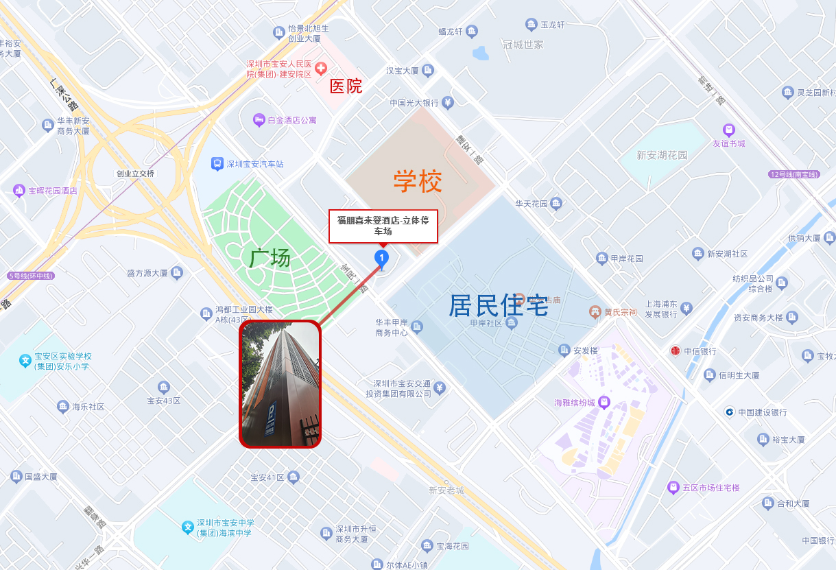 福朋喜來登立體停車場坐落于深圳市寶安區(qū)中心地帶,位于知名五星級酒店福朋喜來登的東南側(cè),新安中學西南側(cè),向東與甲岸社區(qū)(住宅小區(qū))相望。